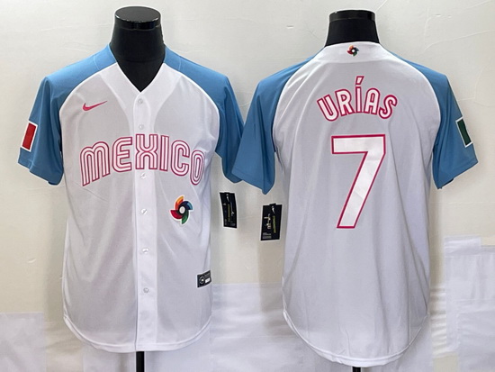 - Men's Mexico Baseball #7 Julio Urias Number 2023 White Blue World Classic Stitched Jerseys