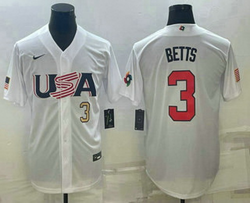 - Men's USA Baseball #3 Mookie Betts 2023 White World Baseball Classic Replica Stitched Jersey